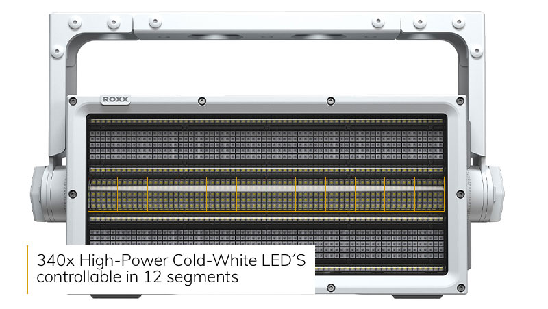 ROXX CLUSTER Blinder verbrauchen 60% weniger Strom als klassische DWE Blinder. Dank ihrer LED-Lebensdauer von 50.000 Stunden ersetzt sie die Installation von Tungsten-Lampen (einmal durchgebrannt) um mehr als das 500-fache.